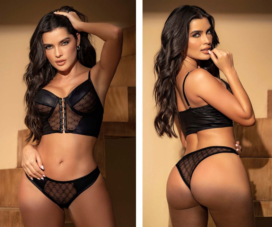 Entfesseln Sie Ihr inneres Selbstvertrauen mit dem zweiteiligen Set Mapale 8778 in atemberaubendem Schwarz. Dieses exquisite Dessous-Set besteht aus einem Bustier-Oberteil mit Bügelunterstützung, gefertigt aus einem luxuriösen Stoff im Wetlook und geometrischen Netzkontrasten. Der vordere Haken- und Ösenverschluss und die verstellbaren Träger sorgen für eine perfekte Passform, während das passende Höschen leichte Bedeckung für einen verführerischen Look bietet.